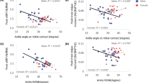 A positive significant correlation was found between SLS depth and the maximal angle of the knee (r = 0.88, p < 0.001) and the ankle (r = 0.53, p = 0.01) in the sagittal plane in females. The minimal angle of ankle dorsiflexion was negatively correlated to squat depth in women (r = − 0.50, p = 0.01). In males the squat depth was significantly, positively correlated with the maximal angle of ankle (r = 0.60, p < 0.001), knee (r = 0.87, p < 0.001), hip (r = 0.73, p < 0.001) and pelvis (r = 0.40, p = 0.02) in the sagittal plane and the maximal angle of knee (r = 0.43, p = 0.01) in the transverse plane (Table 4).