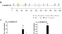 For the analysis of the expression patterns of ScWRKY5 under different exogenous stresses, four-month-old ROC22 tissue culture seedlings were cultivated in water for about 10 d. Two groups of the seedlings were cultured in aqueous solutions of 250 mM NaCl and 25% PEG 8000 solutions, and the leaves were sampled at 0, 0.5, 3, 6, and 24 h, respectively57,58,59. The leaves of the other three groups of the seedlings were sprayed with 5 mM SA (with 0.01% Tween-20, v/v), 25 μM MeJA (containing 0.1% ethanol and 0.05% Tween-20, v/v), and 100 μM ABA, respectively57,58,59. Under the SA, MeJA and ABA treatments, the leaves were collected at 0, 3, and 24 h. All of the samples were frozen in liquid nitrogen and stored at − 80 °C until use. Each sample contained three biological replicates, and each biological replicate contained three seedlings.