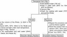 Dietary fiber components were analyzed using the Uppsala method, as described previously17,61. For the analysis of soluble sugars, 1 g of date fruit samples were weighed in falcon tubes, homogenized using an Ultra-Turrax homogenizer, and extracted four times using 10 mL of 0.1% orthophosphoric acid and intermittent centrifugation at 4600 rpm for 15 min at 4 °C. The supernatants were pooled in 50 mL volumetric flasks, and the volume was adjusted. Then, the samples were filtered through a 0.45-μm filter membrane into vials and analyzed via high-performance liquid chromatography. Separations were conducted on a 300-mm-long μ-Bondapak NH2-column (Waters Corporation, Milford, Massachusetts, USA) with an i.d. of 3.9 mm and particle size of 10 mm using 83:17 (v/v) acetonitrile/water as the mobile phase at a flow rate of 1.5 mL/min. Peaks were detected using a diode array detector at 190 nm and quantified against authentic standards of glucose and fructose (Sigma-Aldrich Corporation, Darmstadt, Germany).