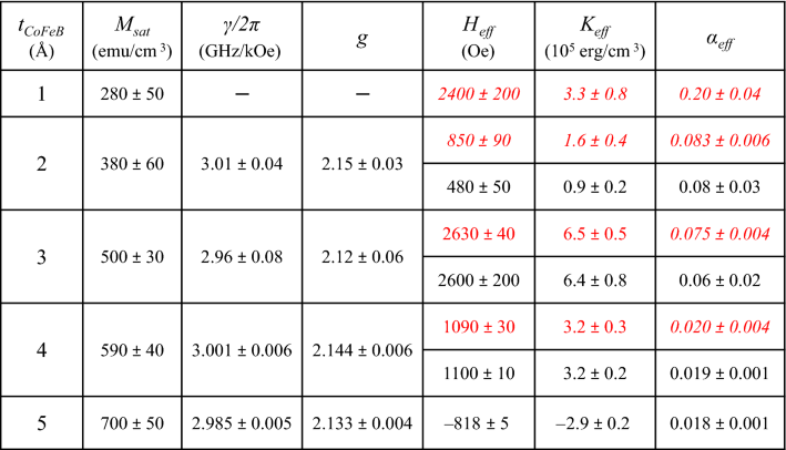 Table 1 Summary of the results for [CoFeB/Pd]N multilayer systems (N = 5 bilayers) as a function of the CoFeB thickness (tCoFeB): the saturation magnetization (Msat) extracted from VSM; the gyromagnetic ratio (γ/2π) and g-factor (g) determined from VNA-FMR fits using Eq. (4); Effective anisotropy field (Heff) determined from VNA-FMR (Eq. 4) and TR-MOKE (Eqs. 2, 3 and 5); Effective anisotropy energy (Keff) determined from Eq. (6); The effective damping (αeff) determined from VNA-FMR and TR-MOKE. Data extracted from the VNA-FMR measurements is shown in black. Data extracted from the TR-MOKE measurements is given in italics and red.