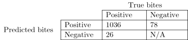 Table 2 Confusion matrix depicting the bite detection performance of EXI using the EaC dataset.