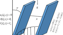 Here \({\mathbf{\mathop{V}\limits^{\rightharpoonup} }},{\mathbf{\mathop{T}\limits^{\rightharpoonup} }}\) and \({\mathbf{\mathop{C}\limits^{\rightharpoonup} }}\) are the velocity, temperature and concentration vectors. \(p,\rho ,\mu ,\rho \vec{b},k,D,\, \, \vec{g}\,\,{\text{and}}\,\,{\text{r}}\) is the pressure, density, dynamic viscosity, body forces, thermal conductivity, thermal diffusivity, gravitational acceleration and Darcy resistance respectively. \({\mathbf{\mathop{J}\limits^{\rightharpoonup} }}\) and \({\mathbf{\mathop{B}\limits^{\rightharpoonup} }}\) is the current density and total magnetic field. As we have considered unidirectional flow, therefore, velocity, temperature and concentration fields of the given flow are as: