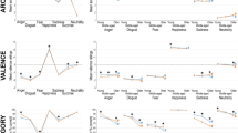 For valence, emotion (F3,114 = 439.12, p < 0.001, ηp2 = 0.92) and treatment (F1,38 = 11.46, p = 0.002, ηp2 = 0.231) had significant main effects, and their significant interaction (F3,114 = 5.22, p = 0.002, ηp2 = 0.121) showed that for the angry and sad conditions, the emotional valence under the non-makeup condition was significantly lower than that of the makeup condition (angry: MD = − 0.169, SE = 0.032, p < 0.001; sad: MD = − 0.093, SE = 0.045, p = 0.046). This suggested that there was a more negative emotional valence for anger and sadness for non-makeup expressers. By contrast, no significant differences were found between the makeup and non-makeup conditions under the happy (MD = − 0.004, SE = 0.043, p = 0.928) and neutral conditions (MD = − 0.006, SE = 0.024, p = 0.809).