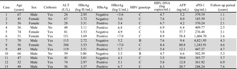 2. HCC, hepatocellular carcinoma; ALT, alanine aminotransferase; HBsAg, hepatitis B surface antigen; HBeAg, hepatitis B e antigen; HBcrAg, hepatitis B core-related antigen; HBV, hepatitis B virus; AFP, α-fetoprotein; sPD-1, soluble programmed cell death-1.