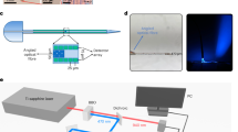 For successful bimodal recording with a silicon probe (Figs. 6 and 8), it is important to achieve proper spatial arrangement among a GRIN lens, a silicon probe and a target brain area. We designed our implantation scheme with the following considerations. First, because we used the GRIN lens that has a working distance of ~ 100–300 µm, the GRIN lens needs to be implanted 100–300 µm above the target area. As shown in Figs. 6 and 8, we successfully placed the GRIN lenses in this distance range, although some portions of the pyramidal cell layer were found to be too close to or far from the GRIN lens in Fig. 7. Second, electrodes should be placed at some distance below the target brain area. This is because (1) electrical recording works from a distance (single-unit: ~ 50 µm, multi-unit: ~ 140 µm)13, (2) the close placement of electrodes causes physical damage of the target brain area and (3) the silicon probe shanks may block the optical imaging of cells below them. Considering that the target structure is above the shanks, we implanted the silicon probe in a way that its electrodes face upward, thereby being closer to the neurons above them. Most recording sites estimated from histological analysis both in Figs. 6 and 8 were located in the position that we aimed at, although a few of the four shanks in each case were off. We observed the shanks of the silicon probe through the GRIN lens in Fig. 6, but not in Fig. 8. This difference is likely due to their difference in distances between the GRIN lens and the shanks; the shanks in Fig. 8 seem to have entered the volume below the GRIN lens more deeply than in Fig. 6. Although it is helpful to be able to confirm the position of electrodes during the experiment, the positioning of the shanks too closely to the GRIN lens may not be ideal because of tissue damage as mentioned above.