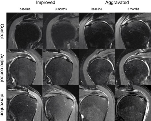 The severity of pain was assessed by visual analog scale (pain VAS) during activity and resting. Shoulder function was assessed by determination of the American Shoulder and Elbow Surgeons (ASES) score, a questionnaire composed of both physician- and patient-rated components. Patients graded the difficulty performing specific daily activities using a 4-point Likert scale. This method has been shown to be reliable and to yield valid results for rotator cuff disorders11. The size of the tear was evaluated by MRI; follow-up images were qualitatively compared with baseline images using a 5-point Likert scale, as follows: markedly increased, slightly increased, stationary, slightly decreased, and markedly decreased. This was used for the statistical analysis, however, for the figure, the 5-point scale was compressed to either “improved”, “no change”, or “aggravated” for visual clarity. Follow-up images were graded by two radiologists (H.S.H, Y.H.J). The assessors were blinded to the intervention and the follow-up period. The inter-rater reliability was good (interclass correlation [standard deviation] = 0.638 [0.348–0.799])12.