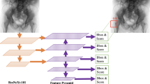 The artificial neural network learning model was built on the ResNeXt+FPN architecture, which was the state of the art in the object domain (Fig. 5). Pre-processed radiographs were firstly sent to the initial encoder (ResNeXt). Then, a feature pyramid network (FPN) collected the feature maps in different scales produced by ResNeXt, and fused them to generate features with both definition and semantic information. The outputs of FPN, referred to as global feature maps, were forwarded by RPN (region proposal decoder)-Head CNN (Convolution Neural Network)-decoder to make global box predictions to fit the labels of lesions on the whole image. Next, the global features were cropped by RoI-Align12 operator according to the global box predictions, and the whole image was cropped simultaneously by the same boxes to make corresponding local labels. Local features were forwarded by Region-based Convolution Neural Network (RCNN)-Head decoder to fit local box labels. Finally, at the clinic scene, RCNN-Head decoder would pick fracture lesion from radiographs instance-by-instance.