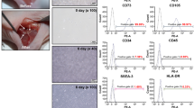 Female Sprague–Dawley rats (10 weeks old) were purchased from SLC Japan (Shizuoka, Japan). The hindlimb ischemia model was established by removing the left femoral artery and vein29,30. The most distal portion of the saphenous artery was ligated, while proximally, femoral artery below the inguinal ligament was ligated. Associated side branches including the popliteal and proximal caudal femoral arteries were also ligated. Tissue perfusion was assessed with a LDPI analyzer and the LDPI index was calculated as the ratio of perfusion of ischemic hindlimb to that of healthy hindlimb. Five days after ischemic induction, rats with LPDI index > 70% were excluded, then randomly divided into the PBS injection (control) and the SB623 cells transplantation (treatment) groups. Seven days after ischemic induction, 1 × 105 SB623 cells in 1 ml of PBS or 1 ml of PBS was injected into the ischemic adductor muscle at 5 different positions with a 26-gauge needle. At 7, 14, 21, and 28 days after cell transplantation, tissue perfusion was measured. For immunosuppression, 10 mg/kg/day cyclosporine was delivered using an Alzet osmotic pump (Alza Corp., Palo Alto, CA, US), which was subcutaneously implanted into each rat at 48 h before cell implantation. The implanted pumps were exchanged biweekly.
