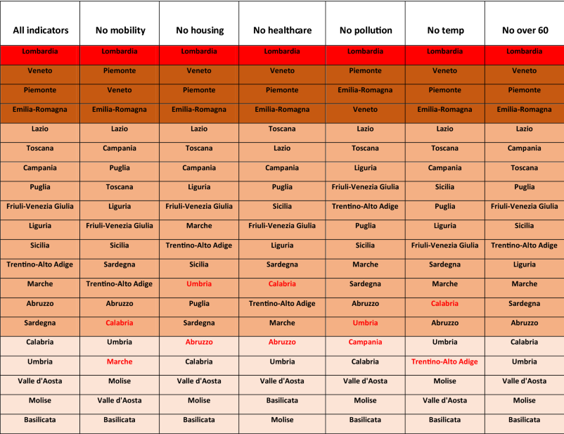 Table 6 Robustness of the a-priori risk ranking, shown in Fig. 3a of the main text, under elimination of single indicators from the risk index definition. The composition of the four risk groups seems to remain mostly unchanged. The few regions that change group have been colored in red. Notice that all these small changes worsen the group composition, in terms of the comparison with the impact indicators shown in Fig. 3a. Only the elimination of the over-60 indicator leaves the groups composition unchanged, probably due to the fact that the fraction of over 60 individuals shows only small fluctuations going from one region to another (see Table 1).