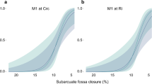The comparative human and chimpanzee samples comprise 105 and 98 scapulae respectively, from different age groups on specimens housed at the National Museum of Natural History (Washington, DC), the American Museum of Natural History (New York City), the Cleveland Museum of Natural History (Ohio), the Museum of Comparative Zoology (Cambridge, MA), and the Powell Cotton Museum (Birchington, UK). Individuals were sorted into seven age categories based on dental eruption and cranial suture fusion as follows: 1—deciduous teeth not fully erupted; 2—all deciduous teeth fully erupted; 3—deciduous dentition and partial or fully erupted M1; 4—M2 partially or fully erupted; 5—erupting canine and/or M3; 6—young adult, full permanent dentition, basioccipital suture open, little tooth wear; 7—full adult, full permanent dentition with basioccipital suture closed, moderate to heavy tooth wear34,83. A balanced sample of 15 individuals from each group both from H. sapiens and P. troglodytes was included, except for group 1 of P. troglodytes, which included 8 individuals. Landmarks were digitized for these specimens using an Immersion MicroScribe G2 digitizer, as was carried out for the Dikika and Nariokotome fossils. Further details of the sample are listed in Table 1.