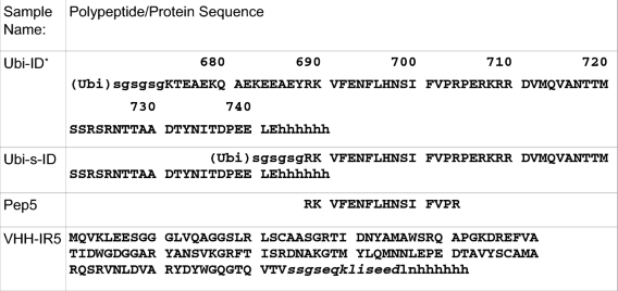 1. *(Ubi) denotes the ubiquitin moiety, which has an amino-acid sequence of MQIFVKTLTG-KTITLEVEPS-DTIENVKAKI-QDKEGIPPDQ-QRLIFAGKQL- EDGRTLSDYN-IQKESTLHLV-LRLRGG. Ubi-ID is, therefore, a 157-residue fusion protein and Ubi-s-ID, a 142-residue fusion protein. For Ubi-ID, Ubi-s-ID and Pep5, upper-case letters designate the amino-acid sequence of the uncleaved single-chain human IGF1R precursor1. In lower-case letters are the linker sequence, sgsgsg (for Ubi-ID and Ubi-s-ID), and the c-Myc tag ssgseqkliseed (in VHH-IR5) and a His6 tag added for protein expression and purification. All expressed proteins contain an artificial Met residue at the N-terminus added by the E. Coli host during protein expression.