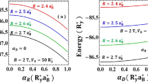 The Fig. 6 depicts our findings for the magnetic-field dependence of the lowest energy levels in the case of an electron confined in a GaAs-Al\(_{0.28}\)Ga\(_{0.72}\)As QDR. The calculations were performed for a fixed configuration with parameters \(z_0=45\) nm, \(z_D=65\) nm, \(R_1=R_2=15\) nm, and \(\theta =45^{\circ }\). These values were chosen in such a way that the QR and the QD are in touch (see Fig. 2c). In addition, three values of the applied electric field have been taken into account. Some values of the l-number have been assigned to the corresponding curves as a guide to the eye. When solving the system as a whole the resulting spectrum actually comes from the interaction between the spectra of the QR and a QD. Analyzing for energies less than 30 meV in Fig. 6a, in general, the states that are doubly degenerate at \(B=0\) (with \(l\ne 0\)) unfold into states whose energies are always increasing with the magnetic field (\(l>0\), red lines), and states with energies that initially decrease and, then, for a certain value of the magnetic field increase, after reaching a minimum (\(l<0\), blue lines). With the behavior of a quantum ring (\(l<0\)), these last states lead to oscillations of the ground state as functions of the applied magnetic field. Note that for \(B=7.5\) T the ground state corresponds to \(l=-2\), while for \(B=4\) T the ground energy comes from \(l=-1\) state. It should be borne in mind that in the ideal spectrum of a QR, the energy states with \(l=0\) are always functions whose slope is monotonically increasing with the magnetic field (black lines). The two lowest energy states with \(l=0\) (black lines) show the presence of QD in the system. The one with the lowest energy presents a growing slope for low fields that, later, becomes an approximately constant slope when \(B>8\) T. In the case of the first excited state with \(l=0\), its low-field slope is approximately zero and, from \(B=8\) T, the slope of the curve systematically augments with the field. This behavior of the two states translates into a repulsion or anti-crossover between them, as shown in Fig. 6a in the region \(B\sim 7\) T with energy of \(\sim 20\) meV.