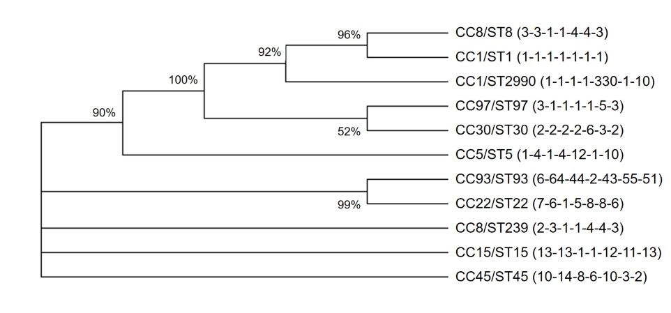The concatenated allelic sequences of the seven housekeeping genes (arcC, aroE, glpF, gmk, pta, tpi, and yqiL) for the central STs of the major clonal complexes (CC1, CC5, CC8, CC15, and CC97) and other frequently encountered clonal complexes (CC22, CC30, CC45, and CC93) were used to construct a phylogenetic tree. Multiple alignments of the concatenated sequences were performed by Molecular Evolutionary Genetics Analysis (MEGA) X39. Next, the aligned sequences were subjected to a statistical selection of best-fit phylogenetic model using jModelTest version 2.1.640. An unrooted tree was subsequently inferred via the ML method using MEGA X software.