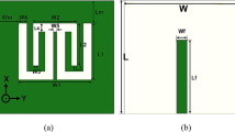 where \({\varepsilon }_{r}\) is the relative dielectric constant, and c is light speed. In terms of guided wavelength (\({\lambda }_{g}\)), the anticipated antennas have substrate size of about 0.592 \({\lambda }_{g}\) × 0.592 \({\lambda }_{g}\), 0.559 \({\lambda }_{g}\) × 0.559\({\lambda }_{g}\), 1.095 \({\lambda }_{g}\) × 1.095 \({\lambda }_{g}\) and 0.6\({\lambda }_{g}\) × 0.6 \({\lambda }_{g}\) at their fundamental resonant frequencies of 2.7, 2.55, 5.2 and 2.74 GHz for Antenna1, Antenna2, Antenna3 and Antenna4 respectively. The guided wavelength has been computed based on18.