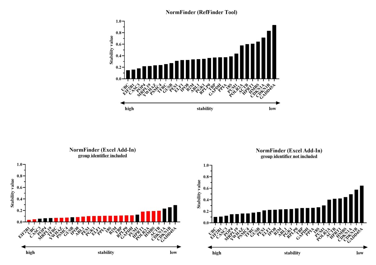 To determine the stability and ranking of the candidate reference genes, we used geNorm16, NormFinder22, BestKeeper25, and delta-Ct26 algorithms available within RefFinder web-tool27. Next, the comprehensive final overall ranking was calculated using this web-tool based on these four algorithms. Moreover, we applied the original NormFinder (Excel add-in) to compare the ranking of the genes and the measure of the absolute stability value with the NormFinder algorithm of RefFinder, as these output data were examined for the different NormFinder applications28.