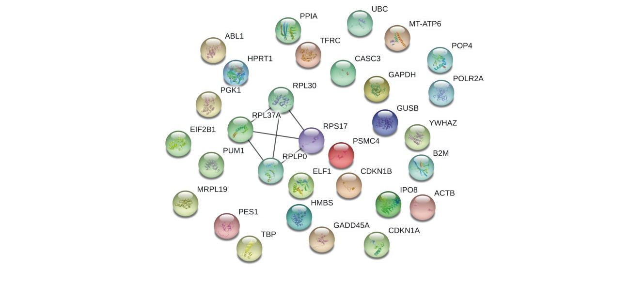 Coregulated genes may increase the chance of being falsely classified as stably expressed by methods that use the pairwise comparison approach23. Robust patterns of coexpression can inform coregulated genes by a common transcription factor when the correlation between their expression is greater than 0.8424. To exclude any potential bias, we detected coexpressed genes with a confidence interaction score ≥ 0.7 (see Supplementary Fig. S1). Therefore, we excluded three coregulated genes (RPL30, RPL37A, and RPS17) from our list of candidate reference genes and retained the RPLP0 gene because of its stability in experimental studies on MSCs (see Supplementary Table S1).