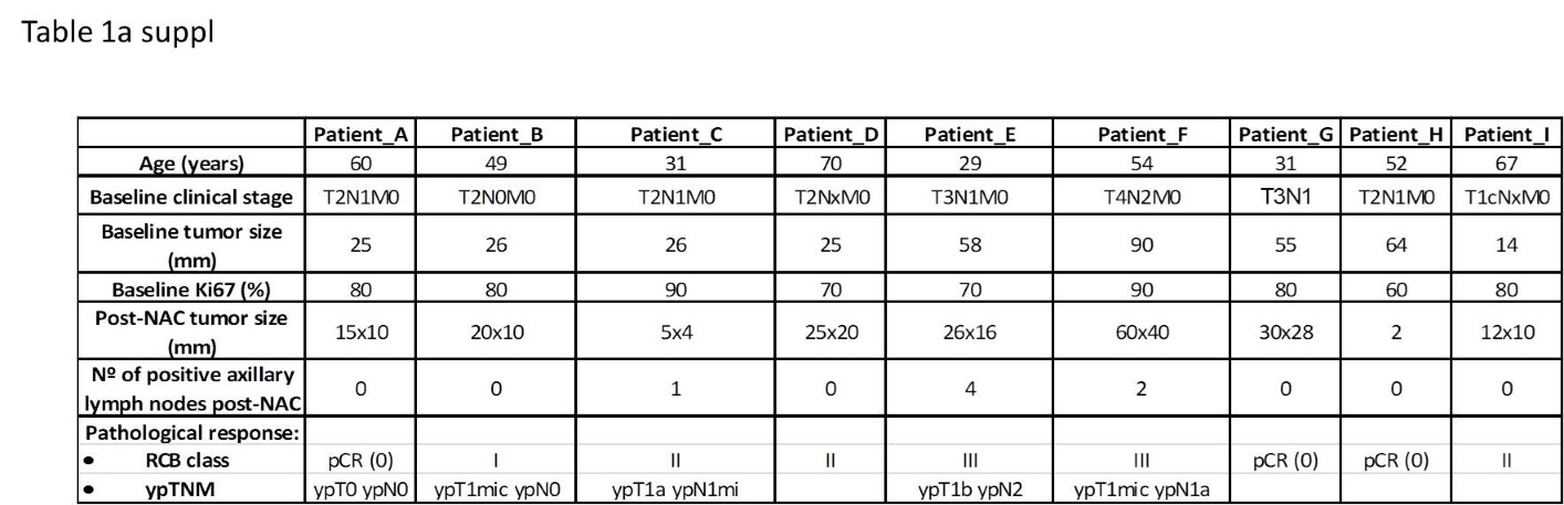 Human breast cancer core biopsies were collected from newly diagnosed TNBC patients (chemotherapy naïve) with UICC stage II or III disease, from two institutions (Hospital Gregorio Marañón and Hospital Clínico San Carlos, Madrid, Spain).The sample collection was approved by the corresponding ethics committee (collection identifier: C.0000188 at ISCIII, Spain) and all patients provided written informed consent. All methods were performed in accordance with the relevant guidelines and regulations, in accordance with the Declaration of Helsinki.