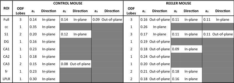 1. Amplitude (a1, a2, a3) and main orientation (direction) of the significant ODF components of both control and Reeler mouse hippocampi are shown. Table cell is gray if the peak amplitude is < 50% of the primary peak. Acronyms list = Full: full field of view; S1: Primary Somatosensory Cortex; cc: Corpus Callosum; CA1, CA2, CA3: field CA1, CA2, CA3 of hippocampus; DG: Dentate Gyrus; fr: Fasciculus Retroflexus; LPLR: Lateral Posterior Thalamic Nucleus.