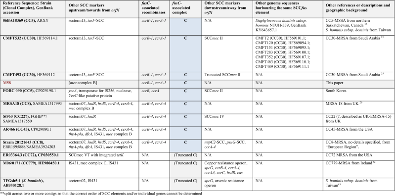 Table 4 Staphylococcal Cassette Chromosomes with a fusC-associated complex C consisting of Q83ZD5, helicase M06, Q6GD51, D3QFP0-SCC, D3JCW9, fusC, tnpIS150, tnp A8YYY6, Q4LAG7-SCCfus and yobV. Please note that this is an abridged version; for a more detailed version, see Supplement 5.