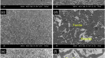 Figure 3d shows the diffusion coefficients for regions A–H as a function of the percentage of martensite volume to total volume in the region. Region A, with a martensite ratio of 3% (97% austenite) shows one diffusion coefficient of Component 1 (solid black circle), corresponding to the single fitting curve in Fig. 3a. Regions B–E with a martensite fraction from 10 to 50% had two diffusion coefficients. These are due to two fitting curves, as shown in Fig. 3b. Diffusion coefficients from fitting Component 1 are shown as blue circles and those of Component 2 as orange circles. The three solid black circles around 70–80% are from regions F, G, and H, which each have a single diffusion coefficient (Component 2), as shown in Fig. 3c. Diffusion coefficients of Component 1 are close to that of the 97% austenite region, and the diffusion coefficients of Component 2 are close to the diffusion coefficients of martensite-dominant regions. What’s unusual here are the regions where the ratio of martensite volume to total volume is 70% or more. These regions still include austenite, but they did not show any properties of austenite diffusion. This is in contrast to austenite-rich regions, where even less than 15% of martensite maintained martensitic properties of diffusion.