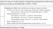 For Asian male adults, obesity was defined as BMI ≥ 27.5 kg/m2 according to the Taiwan’s Department of Health guidelines36,37. The diagnosis of metabolic syndrome was made on the basis of the updated clinical criteria of International Diabetes Federation for the Asian male adults38 as the existence of three or more of the following features: (1) abdominal obesity: waist circumference ≥ 90 cm; (2) low fasting high-density lipoprotein cholesterol < 40 mg/dL; (3) high fasting serum triglycerides ≥ 150 mg/dL or on lipid-lowering therapy; (4) high fasting plasma glucose ≥ 100 mg/dL or on antidiabetic therapy (5) high blood pressure ≥ 130 mmHg for systolic and/or ≥ 85 mmHg for diastolic, or on antihypertensive therapy. The status of metabolic unhealth was defined when two components of the metabolic syndrome were presented6,7. Four groups were thus classified into the metabolically healthy lean (MHL, n = 2510), metabolically unhealthy lean (MUL, n = 331), MHO (n = 181) and MUO (n = 647).