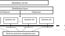 The scheme can be scaled up to larger number of qubit by multiple ways. The basic structure should follow Fig. 1 which systematically demonstrates the mapping of real qubit and its presence in superposition of position state to the multi-qubit computational basis. Extending the same scheme to higher dimensions to represent larger qubit systems is one way of extending the scheme to multi-qubit computation is one straight forward option. A single particle can perform universal computation on multi-qubit system with the help of multiple closed graphs of four vertices in tensor product as shown in Fig. 12. With an increase in number of qubits, different levels of two-qubit equivalent graphs can be added to the system. Each level communicates with different levels with the help of appropriate unitary evolution operators which are the extension of the operators presented for one-dimensional walk in “Quantum computation via discrete-time quantum walk” For example, if a gate is implemented on the fourth qubit, then walk is performed by the particle on the second level of the graph. In such case, we will apply identity on every other level and perform walk on the second level. E.g., if Hadamard operation is applied on the fourth qubit of the five qubit system, one will need two levels of closed graph such that the qubit state is given by \(\vert \phi _c\rangle \otimes \vert \phi _1\rangle \otimes \vert \phi _2\rangle \). If the initial state of the walker is \(\vert 00000\rangle \) then the equivalent state on quantum walk scheme would be \(\vert 0\rangle _c \otimes \vert 00\rangle _1 \otimes \vert 00\rangle _2\), then applying \(H_2\) from Eq. (8) on the second level and identity on the first level will give Hadamard operation on fourth qubit,