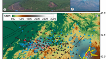 The Tolbachik massif comprises two large stratocones, Ostry (“Sharp”) Tolbachik (3682 m.a.s.l.) and Plosky (“Flat”) Tolbachik (3085 m.a.s.l.), in the southernmost part of the KVG56 at approximately 30 km distance to Kluchevskoy and ~ 20 km distance to Bezymianny (Fig. 1a). A 70 km long zone of monogenetic basaltic cones extends across the Plosky Tolbachik cone; whose southern branch was the place of the 1975–1976 Great Tolbachik Fissure Eruption (GTFE)57. This eruption produced extensive lava fields composed of high-magnesium and high-aluminum basalts, from northern and southern vents, respectively56. With a total DRE volume of ~ 1.5 × 109 m3 (Fig. 1d), it was one of the largest basaltic eruptions in Kamchatka during historical times57. After the GTFE, no signs of activity were recorded until November 2012, when increased seismic activity heralded the beginning of a new eruption28. The 2012–2013 eruption took place at the south flank of the Plosky Tolbachik cone and was dominated by Hawaiian-style activity associated with an emplacement of a large lava field58. During the 205 days of activity, a lava volume of ~ 0.5 × 109 m3 was erupted, with a gently declining trend throughout the whole eruptive period58. Satellite geodesy could reveal the intrusion of a 6.1 km long dike intrusion, opening up to 8 m, adding almost 10% to the total eruption volume59.The activity ceased entirely by the end of August 2013. According to Koulakov et al.18, one magmatic pathway of Tolbachik appears to be connected with the marginal part of the Klyuchevskoy deep reservoir, and another seems to originate from an independent mantle source located to the south of Tolbachik.