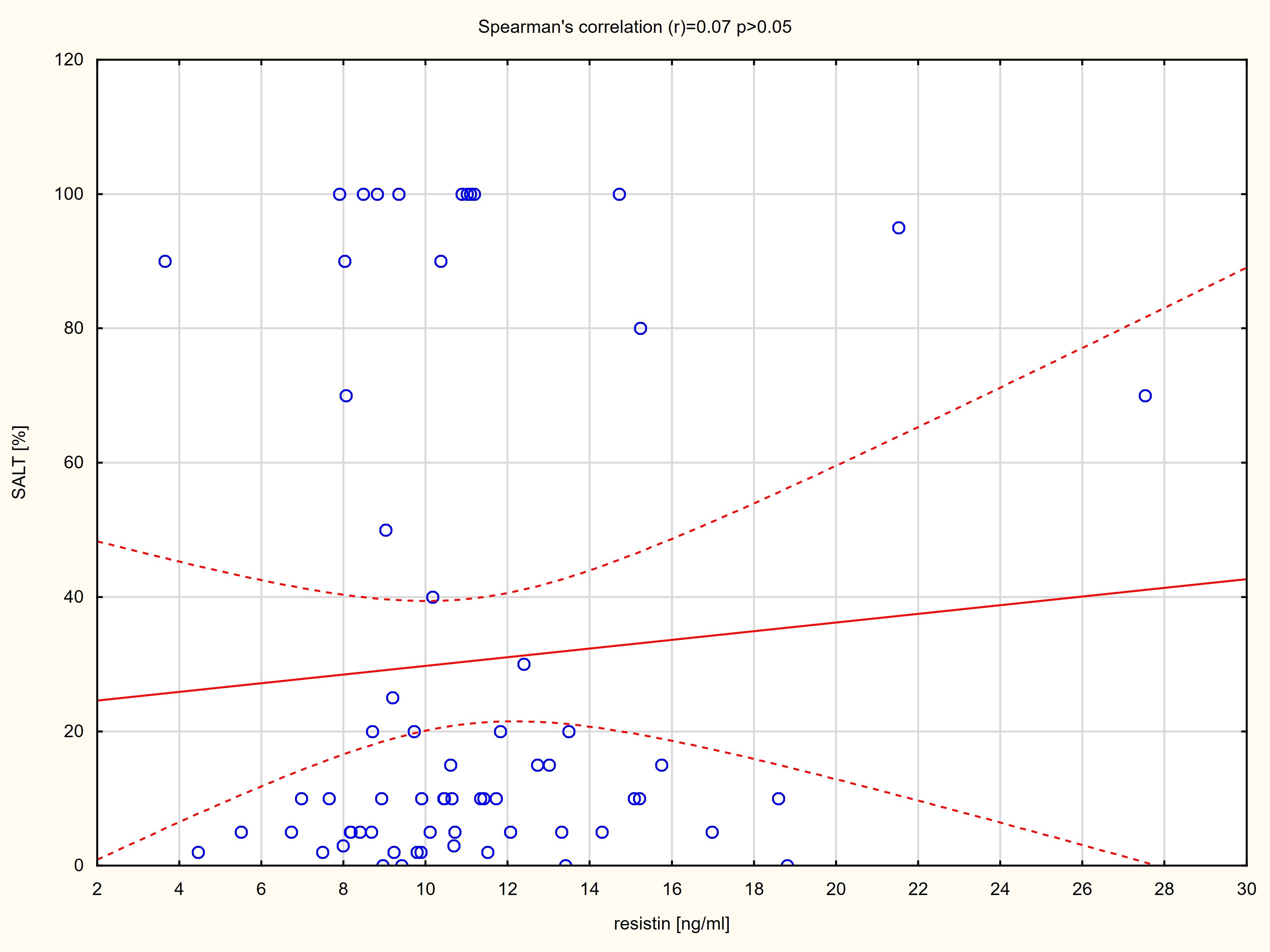A statistically significant negative correlation was detected between the serum concentrations of adiponectin and SALT score (r = − 0.26; p < 0.05) (Fig. 3).