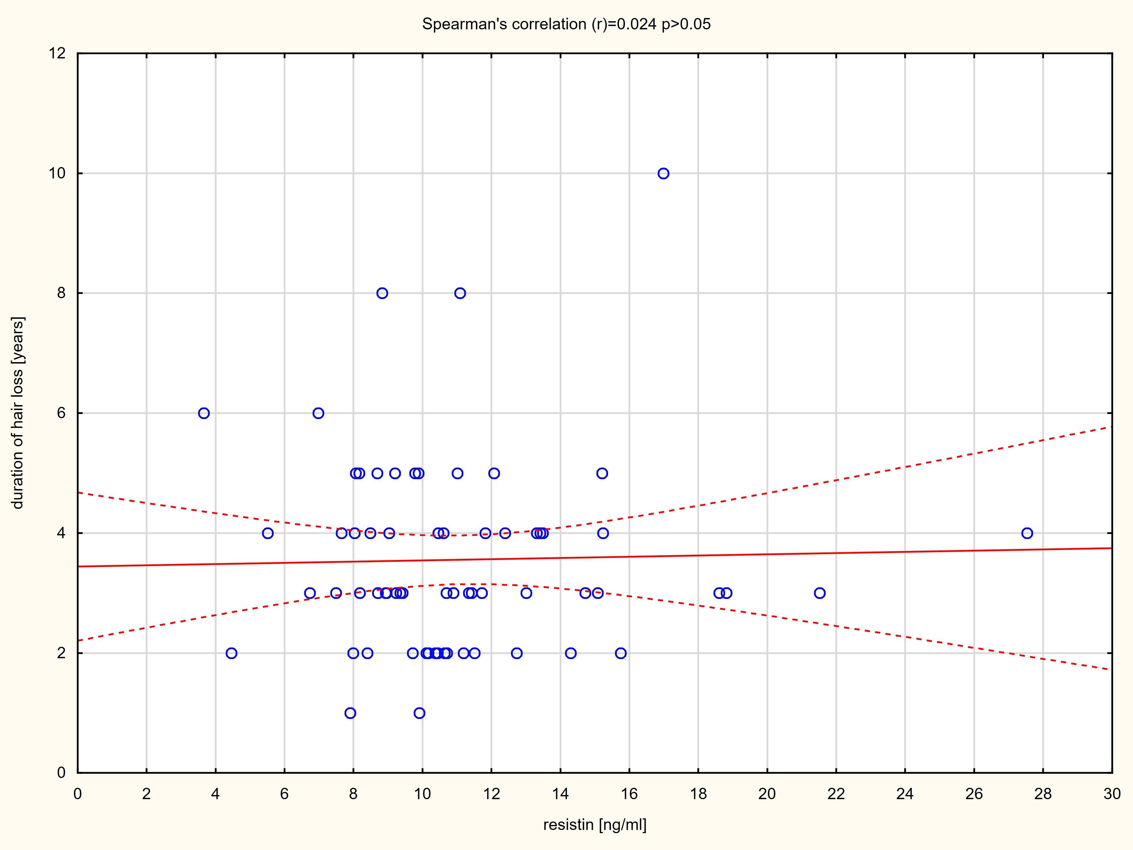 No significant correlations were observed between the serum concentrations of adiponectin and resistin and the duration of hair loss (p > 0.05) (Suppl. Figures 2, 3). Moreover, there were no correlations between the serum levels of adipokines, age and BMI of the patients with alopecia areata (p > 0.05).