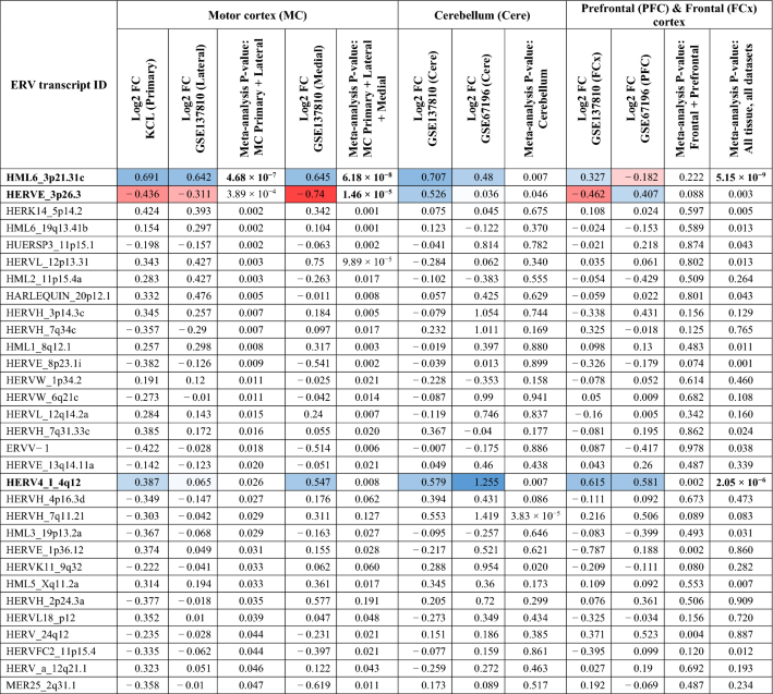 2. Bold: Significant Stouffer’s meta-analysis p value, beyond Bonferroni multiple-testing correction for 3237 transcripts (p < 1.5 × 10−5). Cells highlighted in blue indicate increased expression in ALS samples; cells highlighted in red indicate decreased expression in ALS samples, compared to controls, where transcripts had a p < 1.5 × 10−5 in any meta-analysis.