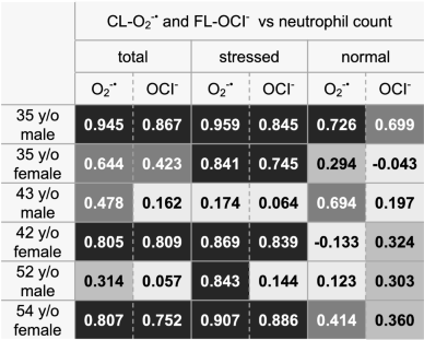 3. Right: Correlation coefficients of CL-O2−· and FL-OCl with the neutrophil count in the normal data range.