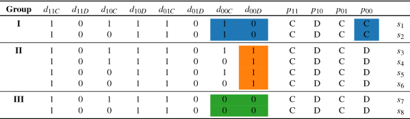 1. The left eight columns contain the reputational update and the right four columns represent action response. An agent with reputation m interacting with another agent with reputation n will cooperate/defect according to \(p_{mn}\). Similarly, the opposing agent will act according to \(p_{nm}\). New reputations after interaction are assigned as \(d_{mnp_{mn}}\) and \(d_{nmp_{nm}}\) respectively.