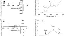 For pressure-dependent Fourier-transform infrared (FTIR) spectroscopy studies, the protein was dialysed against D2O using Amicon Ultra centrifugation units with 10 kDa cut-off and subsequently lyophilized. The measurements were carried out in the same buffer conditions as for the HPSF measurements in the absence and in the presence of 0.25 M Mg(ClO4)2. A protein concentration of 5 wt% was used. The pD-value of both buffers was adjusted to 7.8 (pH + 0.4 = pD) by adding DCl. The temperature of the cell was regulated with an external, circulating water thermostat to − 3 °C. The equipment and setup of the high-pressure system has been described elsewhere13. Spectra were processed and analysed with the Grams AI 8.0 software (Thermo Fisher Scientific) as follows: after buffer subtraction and smoothing, the area of the amide I′ band was normalized to 1. The number of subbands and their positions for fitting were obtained via Fourier self-deconvolution (FSD) and 2nd derivative approaches. The amide I′ band region of α-chymotrypsin can be decomposed into eight subbands as already reported elsewhere45. To determine the relative changes in the population of secondary structure elements, mixed Gaussian–Lorentzian line shape functions were used to fit the peak areas in the amide I′ band region (curve fitting procedure)46. Assuming a two-state unfolding process of the protein, a Boltzmann function can be fitted to the temperature- and pressure-dependent sigmoidal curve progression of the intensity changes: