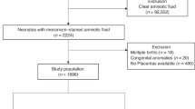 Between March 2013 and December 2018, a total of 7772 neonates were born at the birth centre of the Nagoya City University West Medical Centre. In the current study, 1389 term neonates with meconium-stained amniotic fluid were reviewed. In this centre, histopathological examination of the placenta is routinely performed for neonates with meconium-stained amniotic fluid. The following neonates were excluded: 39 neonates whose placentae were unavailable and 10 neonates subsequently diagnosed with major congenital anomalies. Additionally, four multiple gestations were excluded because of potential contamination of the amniotic fluid between the siblings. Consequently, 1336 neonates were available for analysis (Fig. 1).