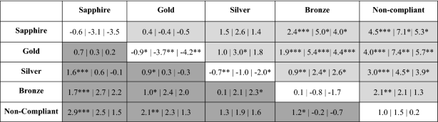 Table 4 Matrix showing the difference in speed over ground, broadband (5–1000 Hz) source level, and sound exposure level (SOG (m s−1)|SL (dB re 1 μPa2 @1 m)|SEL (dB re 1 μPa2s)). Asterisks show degree of significance (p < 0.05 = *, p < 0.01 = **, p < 0.001 = ***). Light grey cells show the difference in means between award tiers while the fleet-based vessel speed reduction program was active. Dark grey cells show the difference in means between award tiers while the fleet-based vessel speed reduction program was inactive. White cells show the difference in means within an award tier while the fleet-based vessel speed reduction program was active v. inactive.