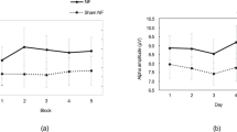 The analysis of the NF index showed a significant interaction between session and group (F(1, 46.049) = 5.01, p = 0.030, supplementary Tables S25 and S26). This result suggests a significant different linear evolution of the NF index across sessions between groups. Our planned comparisons (linear mixed models run in each group) showed a significant linear increase on the NF index across sessions in the NF group (β = 0.04, CI [0.03, 0.06], F(1, 2057) = 32.43, p < 0.001, supplementary Tables S27 and S28), whereas a significant linear decrease was found in the control group (β = − 0.04, CI [− 0.06, − 0.02], F(1, 1899) = 19.43, p < 0.001, supplementary Tables S29 and S30). These findings indicated an increase of the NF index across sessions, specific to the NF group (Fig. 3a). Although these results could be due to a baseline difference at the first session, an independent t-test between the mean levels of NF index of each group at session 1 did not show a significant difference between groups (t(46) = − 1.8, p = 0.0789). See “11. Group comparison at the first session” supplementary section and supplementary Table S63 for details.