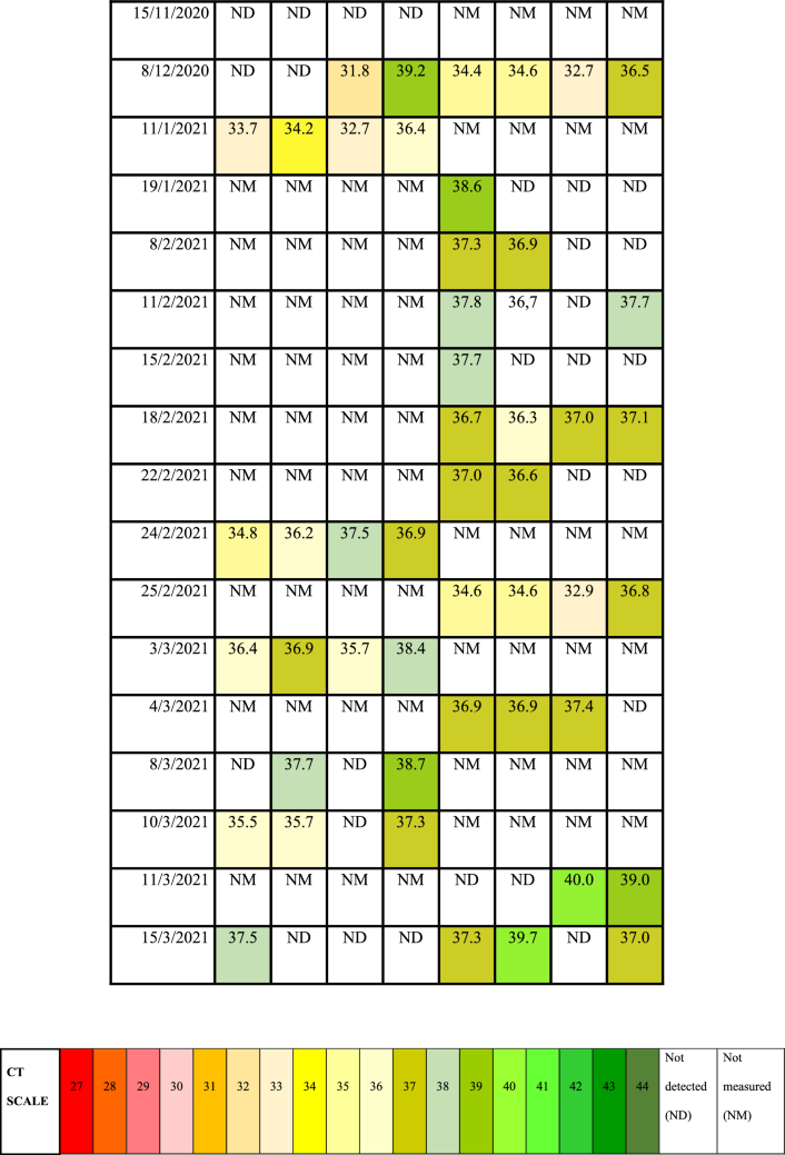 Table 2 CT values measured by RT-qPCR of 4 genes (ORF1ab, S, E, RdRp) of influent at WWTPs. ND represents dates with performed measurement but no detected positivity of the samples. NM represents dates with not performed measurement of the samples.