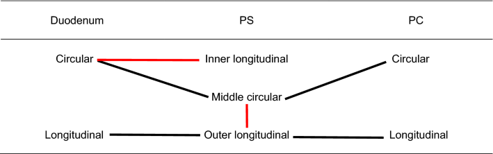 1. The PC has two muscle layers: the inner circular and outer longitudinal muscle bundles. The pyloric sphincter (PS) has three muscle layers: inner longitudinal, middle circular, and outer longitudinal bundles. The duodenum has two muscle layers: inner circular and outer longitudinal bundles. Some of the outer longitudinal bundles of the PS were connected to the middle circular bundles of the PS. The inner longitudinal bundles of the PS were connected to the circular bundles of the duodenum. Red lines indicate connections between the longitudinal and circular bundles. Black lines indicate continuous longitudinal or circular fibers between the PC and the PS and between the PS and duodenum.