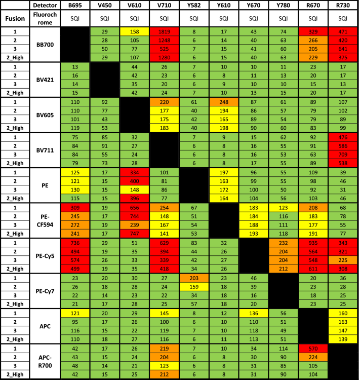 Table 2 Comparison of all four Fusion setup: the SQI values for 10 fluorochromes run on three different Fusions are shown.