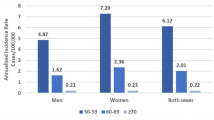Among the nested models (Table 2), the age-period-cohort model (p = 0.739), age-cohort model (p = 0.682), age-period model (p = 0.103), age-drift model (p = 0.098), and age alone model (p = 0.109) could not be rejected (p > 0.05), whereas the period-cohort model (p < 10–3) was rejected. Analysis of the specific model by sex (Table 3) had similar results. Neither the effect of the period of disease nor the effect of the birth cohort could be isolated, because none of the one-parameter models (Pd, Cd, P and C) fitted the data. We identified no trend by the different models.