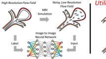 The image data were acquired from the scanning of 3-D time-of-flight (TOF) and peripheral gated (PG) phase-contrast (PC) MRA on a 3T clinical MRI scanner (Siemens Magnetom Prisma) using a 64-channel head and neck coil. As shown in Fig. 9a, the TOF-MRA images with a high resolution of \({0.33}^{2}\times 0.5{\mathrm{mm}}^{3}\) are to anatomically extract the artery system. The TOF-MRA images are on DICOM data. In general, the image segmentation can be done by different software such as Materialise Mimics and 3D Slicer and exported in an STL format to follow the illustrated flowchart in Fig. 1. Since we have developed a method to do image segmentation from DICOM format and calculate the volumetric parameter \(\mathcal{P}\left(\vec{x}\right)\) and the normal direction vector \({\vec{N}}^{w}\left({\vec{x}}_{b}\right)\) of each boundary cell29,49, the STL format is not necessary. We segmented the left carotid (with a bifurcation) and vertebral (tube-like) arteries, shown in Fig. 9a from the 3-D TOF-MRA images. The PC-MRA images in Fig. 9b, provide the 4-D velocity profiles on the cross-sections from the bottom up with a spatial resolution, \({0.44}^{2}\times 5{\mathrm{mm}}^{3}\) resulting in 10 slices in the vertical direction, and a time resolution of \(25\mathrm{ms}\) resulting in 20 time points in one cardiac cycle. We use the in-house Matlab code to extract the 4-D velocity vector fields from the PC-MRA images for both vertebral and carotid arteries based on the method we developed66. Figure 10 shows the velocity magnitude contours on Slice 1 of the vertebral artery at 7 representative time points in one cardiac cycle. The 4th time point corresponds to the peak systole of the heart pumping. We simulated the blood flow in both carotid and vertebral arteries. The dimensions of the two arteries are found in Fig. 9a. The TOF-MRA resolution results in grid sizes of \({106}^{2}\times 416\) for the carotid artery and \({60}^{2}\times 416\) for the vertebral artery. The time resolution is 1 ms via linear interpolation of the PC-MRA data in Fig. 9b. The blood flow is driven by the 3-D velocity profiles at the inlet (Slice 1) and outlet(s) (Slice 10). We impose the non-equilibrium extrapolation scheme61 to introduce the velocity boundary conditions at the inlet and outlet(s). The density and kinematic viscosity of blood are \(1.06\times {10}^{3} \mathrm{kg}/{\mathrm{m}}^{3}\) and \(3.3\times {10}^{-6} \mathrm{m}/{\mathrm{s}}^{2}\), respectively. The relaxation time \(\tau =0.505.\)