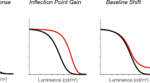 In order to assess which model best captured individual observer’s arousal modulation on the PLF, the Easy (low arousal) data were first fit with the modified decrement Naka–Rushton equation (Eq. 1). The parameter estimates obtained (\(P_{max}\), \(L_{50}\), \(P_{min} ,\) and \(n\)) were then treated as fixed parameters when fitting the Hard (high arousal) data with the 7 models described above (e.g., Eqs. 2–4 and combination models). When fitting the Hard data with each of the 7 models, the additional arousal parameter, \(A,\) was the only parameter we obtained the best estimates for. To evaluate the most parsimonious model to account for the modulatory effect of arousal on the data, we then calculated the corrected Akaike Information Criterion (AICc), using sum of square errors (SSE). The corrected AIC was used as it better takes into account smaller sample sizes (N < 30)46. In the selection of the best parsimonious model, we then calculated ∆AICc, by subtracting the minimum AICc value out of all seven models from all the other models’ AICc values. The closer a ∆AICc value is to zero, the better the model is believed to explain the data, compared to other models.