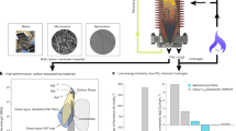 where \({\dot{n}}_{out}\) and \({\dot{n}}_{in}\) are the production amount of the total graphitic carbon (mol) and the total supplied carbon (mol), respectively, in a given synthesis time34. We performed TGA to evaluate the \({\dot{n}}_{out}\) value at 1673 K, which reveals a graphitic carbon content of 57 wt% (Supplementary Fig. S8). Considering the graphitic carbon content, the carbon efficiency at 1673 K is 4.3%. After the synthesis, one end of the as-grown CNT bundles was attached to the end of an individual channel of the gas rectifier and the other end to the mesh filter that was placed downstream of the reactor (Supplementary Fig. S1a). To collect the sample, the as-grown CNT bundles attached to the mesh filter were cut off, and the gas rectifier with the as-grown CNT bundles was removed from the reactor tube. Finally, the as-grown CNT bundles were removed from the gas rectifier.