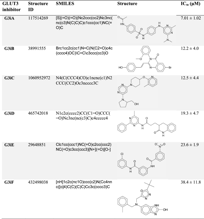 1. For each GLUT3 inhibitor, the ChemNavigator structural ID, SMILES code, and IC50 values for GLUT3 inhibition are indicated. Corresponding dose–response curves are in Fig. 2B–G. G3iA, G3iB, and G3iD are inhibitors resulted from TBVS of the outward-facing GLUT3 conformation; G3iC, G3iE, and G3iF are inhibitors produced by TBVS of the inward-facing GLUT3 conformation.