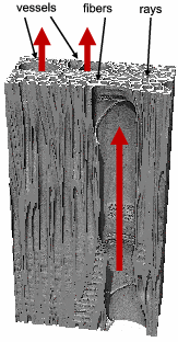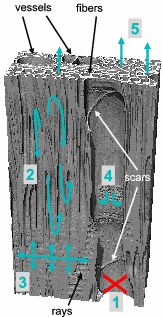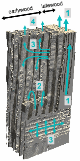 Fast rise in vessels. No imbibition in the rest of the structure. | Water meniscus blocked in vessel scars (1). Slow rise/spread through fibers (2) and rays (3). Some vessels supplied in water by rays (4). Vertical rise insured by fibers (5) | Fast rise in latewood (1). No rise or spread in earlywood | Fast rise in latewood (1). Slow rise and spread in earlywood, in connected tracheids (2) and rays (3). Earlywood tracheids participate in vertical rise (4) |