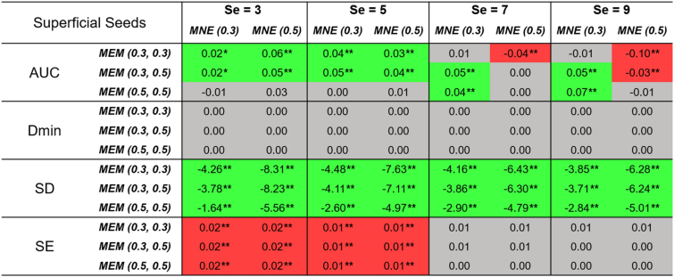 Table 1 Wilcoxon signed rank test results of reconstruction performance comparison of MEM and MNE in superficial seeds case. Median values of paired difference are presented in the table.