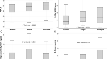 In the multivariable analysis identifying factors associated with increases in HT, increases in trichotomized CMB numbers (β = 1.00 [95% CI 0.39–1.61], p = 0.001) were associated with increases in HT, while WMH (β = − 0.1 [95% CI − 0.22 to 0.02], p = 0.108), and IV thrombolysis (β = − 0.14 [95% CI − 0.34 to 0.06], p = 0.163) was not, along with age, sex, comorbid hypertension, infarct volume, and successful reperfusion as co-variables (Table 4).