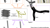 One of the main complications was TIPS dysfunction in up to 80% of all patients within 2 years, in the old era of bare metal stents8,9. After years of resolving mostly technical problems, the introduction of polytetrafluoroethylene (PTFE) covered stents in the millennials marked an important development with a reduction but not abolishment of shunt dysfunction, even in smaller stent diameters2,10,11,12,13,14. TIPS dysfunction, stenosis and occlusion, among other factors15,16,17,18, seem to be influenced by the hemodynamic flow characteristics19, which themselves are influenced by the geometry of the TIPS stent. In the modern era of PTFE-covered TIPS stents, some studies suggested that characteristics of TIPS stent geometry, such as portal venous inflow, retrieved by two-dimensional (2D) angiography during the procedure might predict TIPS dysfunction20,21. Some smaller series suggested an association of the landing zone of TIPS stent in the portal or hepatic vein with the development of TIPS dysfunction. The placement of the TIPS stent in the hepatic vein to IVC junction seems important to reduce the risk of hepatic venous stenosis or occlusion17,22,23,24,25,26,27,28. Moreover, interventional embolization of spontaneous portosystemic shunts (SPSS) during TIPS procedure was associated with less episodes of hepatic encephalopathy29. Larger cohort data on predicting the development of TIPS dysfunction as early as at the time of TIPS placement is still scarce, given the potentially devastating effects of recurrent variceal bleeding and ascites.