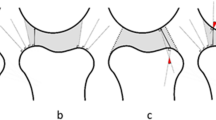 A number of studies have reported that radial shortening provides acceptable clinical results for Kienböck’s disease27,28,29, and that this osteotomy achieves revascularization and unloads the diseased lunate10,30,31. Several biomechanical studies have demonstrated that radial shortening unloads the lunate by shifting the load toward the distal ulna32,33. Using a cadaveric model, Werner et al. showed that relative shortening of the radius by 2.5 mm shifted the load on the lunate from the radiolunate to the ulnolunate articulation30. Masear et al. and Trumble et al. used strain gauges mounted on the lunate to show unloading of the lunate following radial shortening or ulnar lengthening32,33. The present data showed that the contact area shifted radially and dorsally after radial shortening in living subjects, and all patients could return to their previous activities with no disturbance in wrist function. Therefore, it seems reasonable to conclude that decompression of the lunate is achieved by the biomechanical effects of radial shortening itself, in which the load on the lunate is shifted onto the scaphoid.