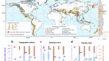 To identify the influence of possible landslide controls, we analyzed geological and tectonic conditions (involving seismicity, recent uplift and long-term erosion), topography and distribution of precipitation (Supplementary Fig. 2). From topographic characteristics we used local relief, slope, hypsometric integral and residual relief, which were calculated from NASADEM global digital elevation data at a nominal resolution of ∼ 30 m (https://lpdaac.usgs.gov/products/nasadem_hgtv001/). Local relief was calculated within a 5 km circular window to capture the common wavelength of the topography. Residual relief is defined here as the difference between the DEM surface and a base-level surface interpolated with the Inverse Distance Weighting (IDW) algorithm from the elevation of the channel network with an upslope contributing area larger than 2.5 km2. Geology was digitized from the 1:1,000,000 maps of Chile (SERNAGEOMIN, 2000) and Argentina (SEGEMAR, 1995) and the fault pattern was complemented by newly identified Quaternary faults from Georgieva et al.40. Lithologies mapped in geological maps were simplified into six different rock units (Fig. 1). Potential exposure of individual landslides to regional seismicity was approximated by the calculation of Arias Intensity41. We followed the approach of Crosta et al.17 and calculated sum of Arias Intensity of sufficiently strong earthquakes (based on Ms and distance42) for given 50-km2. We obtained earthquakes (Ms ≥ 3) from the USGS Earthquake Catalog (https://earthquake.usgs.gov/earthquakes/search/). To determine the position of landslides relative to the long-term erosion of the area, Apatite Fission Track (AFT) ages were interpolated from Thompson et al.43, Rojas Vera et al.44, and Goddard and Fosdick45. We also considered published AHe ages27,40,43,45, but did not interpolate them due to the uneven coverage of the area. Recent uplift rates for the central part of the PIS area (surroundings the NPI and SPI) were extracted from Richter et al.36. We characterize first-order climatic patterns of the area as annual precipitation totals estimated for the period 1970–200046 (available from WorldClim.org).
